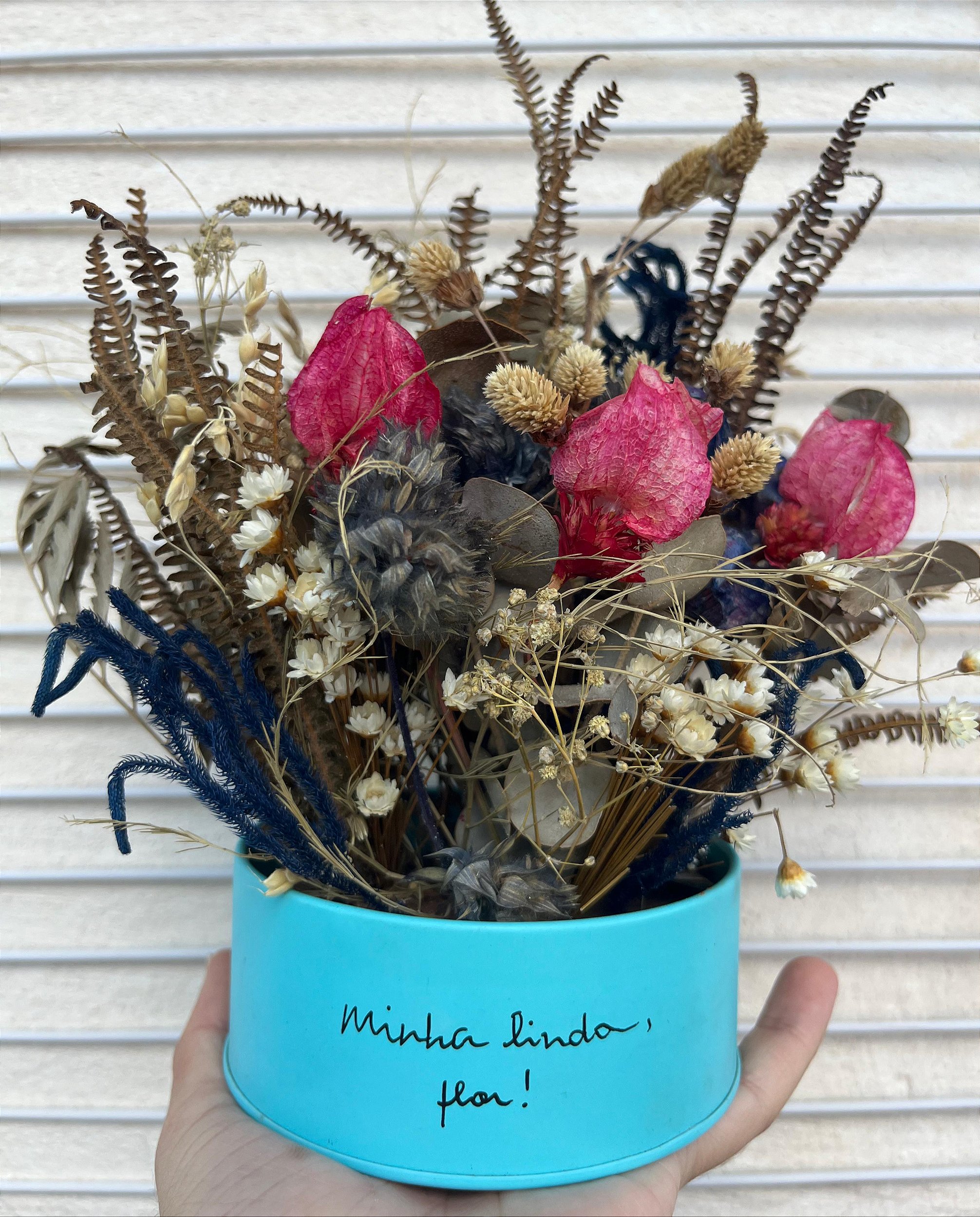 Lata: Cor azul piscina, formato redonda ou coração. Frase escrita à mão pode ser modificada, contando que siga o mesmo tamanho da imagem.